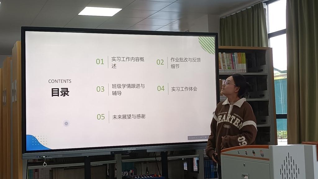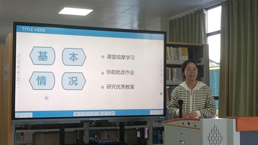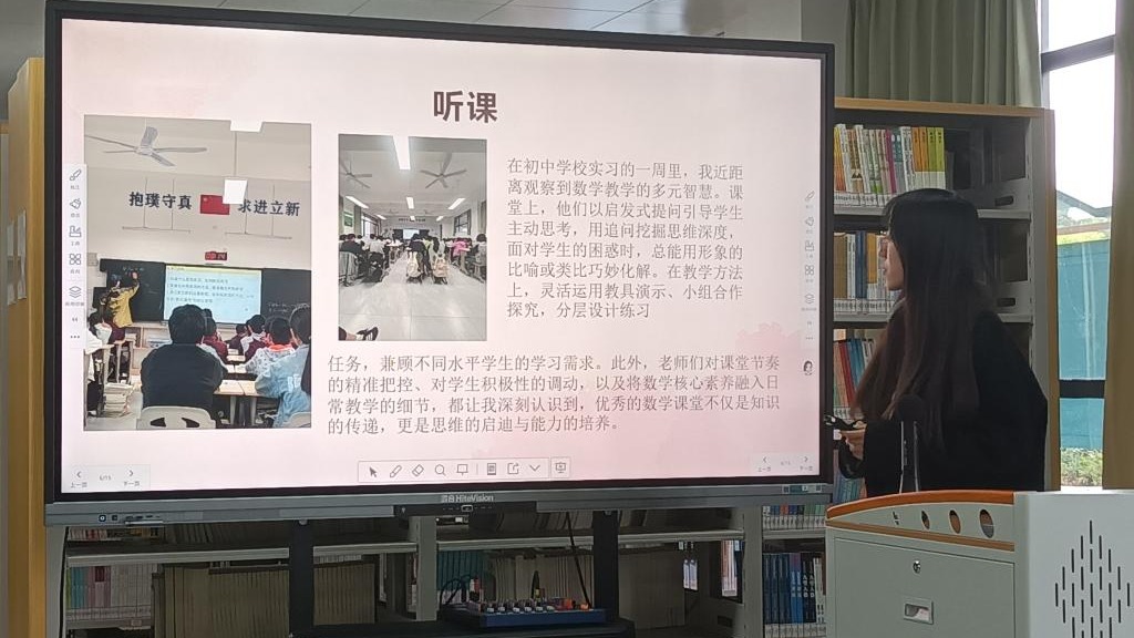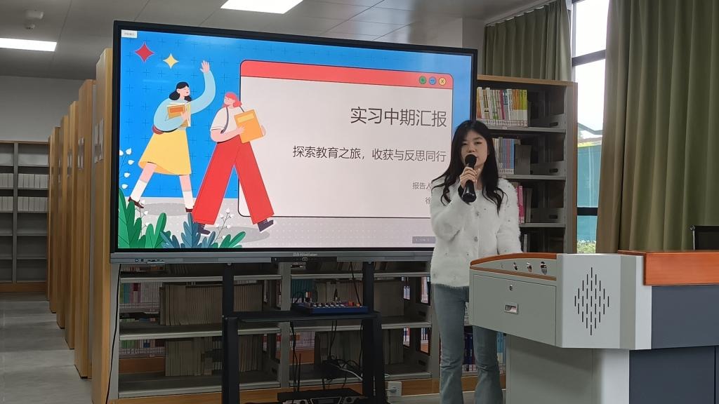 教学实践锤炼专业能力。在课堂教学展示环节,实习生们展现了从理论到实践的跨越与成长。张诗雨同学以《诫子书》为例,分享了在小学与初中不同学段的因材施教策略;郭佳璐同学回顾了八年级语文教学从紧张到从容的蜕变历程;王子睿同学则通过数学课堂的层层引导,阐释了教学设计对教学实效的提升作用。