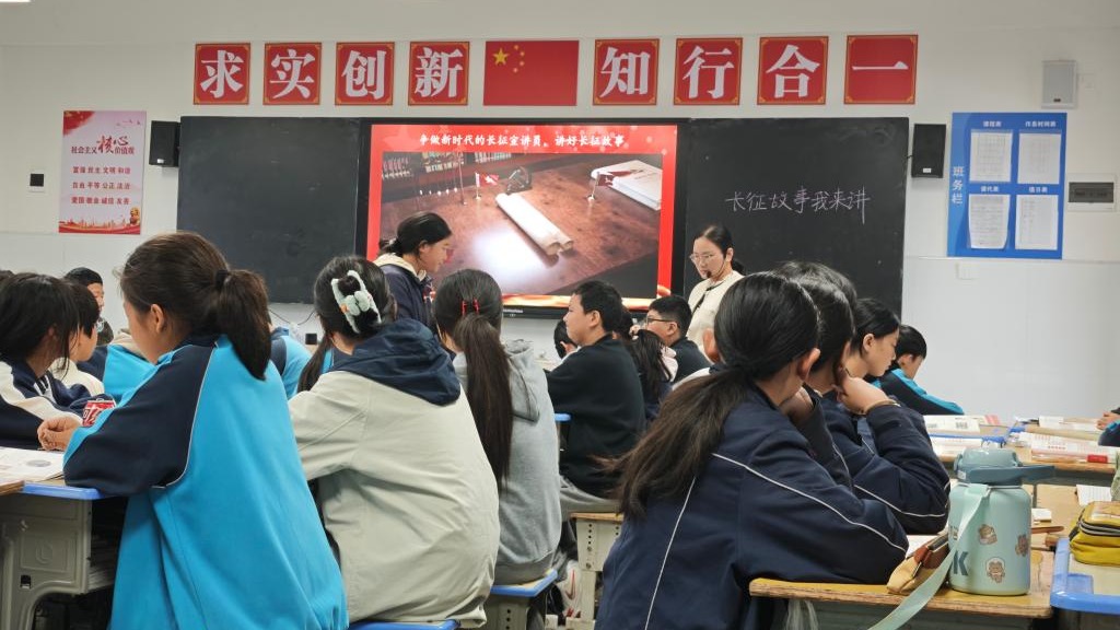 语文、历史、美术学科围绕“红色主题”实现跨学科联动。10月31日,尹萱萱老师在语文课《七律·长征》中,通过“意象品读—故事分享—精神践行”三层设计,让学生从“红军不怕远征难”中领悟信仰力量;沈婷婷老师的美术课则以“万水千山”为题,指导学生用画笔再现长征场景,一幅幅雪山与青山相映的作品,成为革命精神代代相传的生动诠释;历史课堂通过重温长征路线、解读重要节点,引导学生深入理解长征的历史意义,并结合习近平总书记对长征精神的重要论述,启发学生在实际生活中传承红色基因。